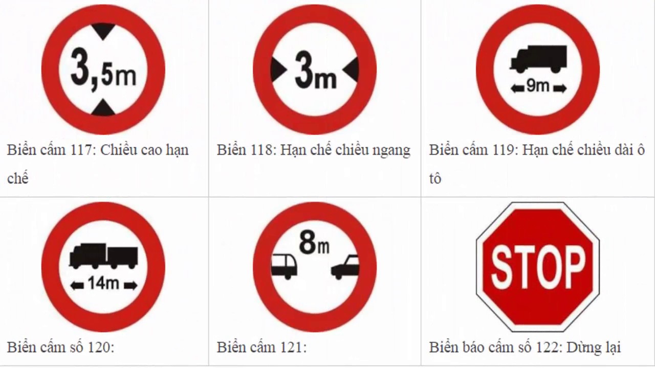 Biển báo cấm 117: Hạn chế chiều cao: Cho biết đây là đoạn đường cấm các xe cơ giới và xe thô sơ, kể cả các được ưu tiên có chiều cao của toàn bộ xe và hàng lớn hơn thông số ghi trên biển