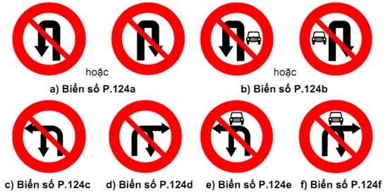 Biển báo cấm 124a: Cấm quay xe: Cho biết đây là đoạn đường cấm các loại phương tiện xe cơ giới và xe thô sơ quay đầu, chỉ trừ các phương tiện được ưu tiên theo luật định.